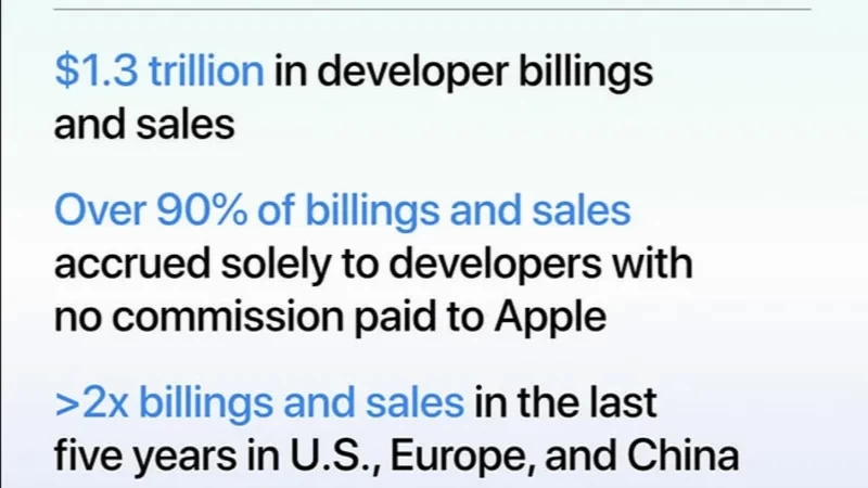 חנות האפליקציות הגלובלית של אפל ממשיכה להוות מנוע צמיחה משמעותי עבור מפתחים ברחבי העולם, עם מכירות והכנסות של 1.3 טריליון דולר בשנת 2024. על פי מחקר חדש שנערך על ידי פרופסור אנדריי פרדקין מאוניברסיטת בוסטון וד"ר ג'סיקה ברלי מקבוצת אנליסיס, מעל 90 אחוז מהמכירות וההכנסות שהופעלו על ידי חנות האפליקציות לא כללו עמלות לאפל.