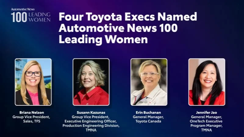 בפלאנו, טקסס, הודיעה חברת טויוטה מוטור צפון אמריקה (TMNA) על כך שארבע מנהלות בכירות נבחרו להיכלל ברשימת 100 הנשים המובילות בתעשיית הרכב בצפון אמריקה, כפי שפורסם על ידי Automotive News. רשימה זו מכירה בנשים שהן מנהיגות בתחום הרכב – אלו שמקבלות החלטות משמעותיות ובעלות השפעה ניכרת בחברותיהן.